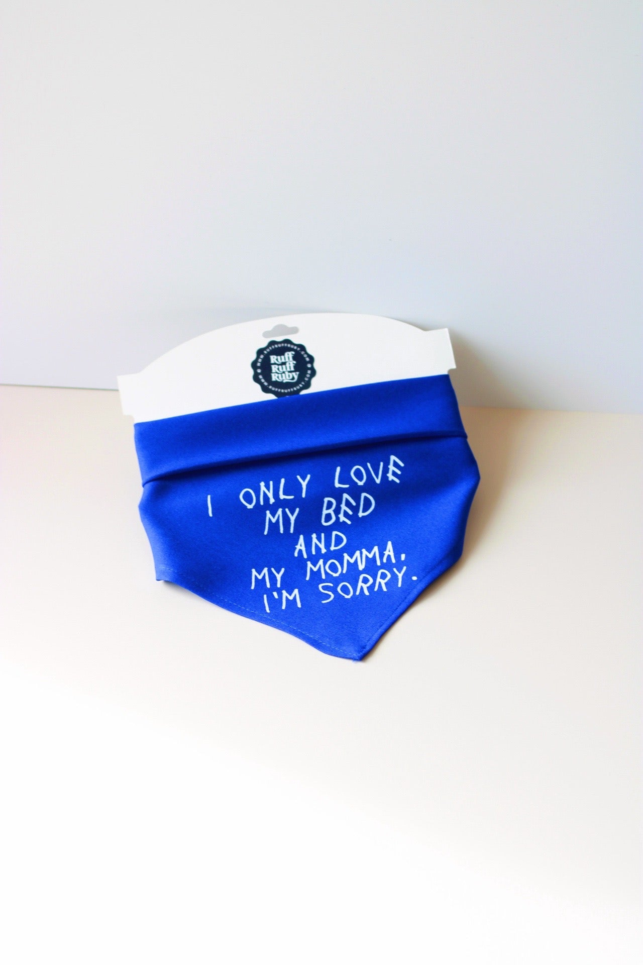 Our I Only Love My Bed & My Momma Dog Bandana is made of 100% polyester and can be folded and tied to create any size bandana of your choice for neck sizes 10-22". This bandana comes in black with white text.